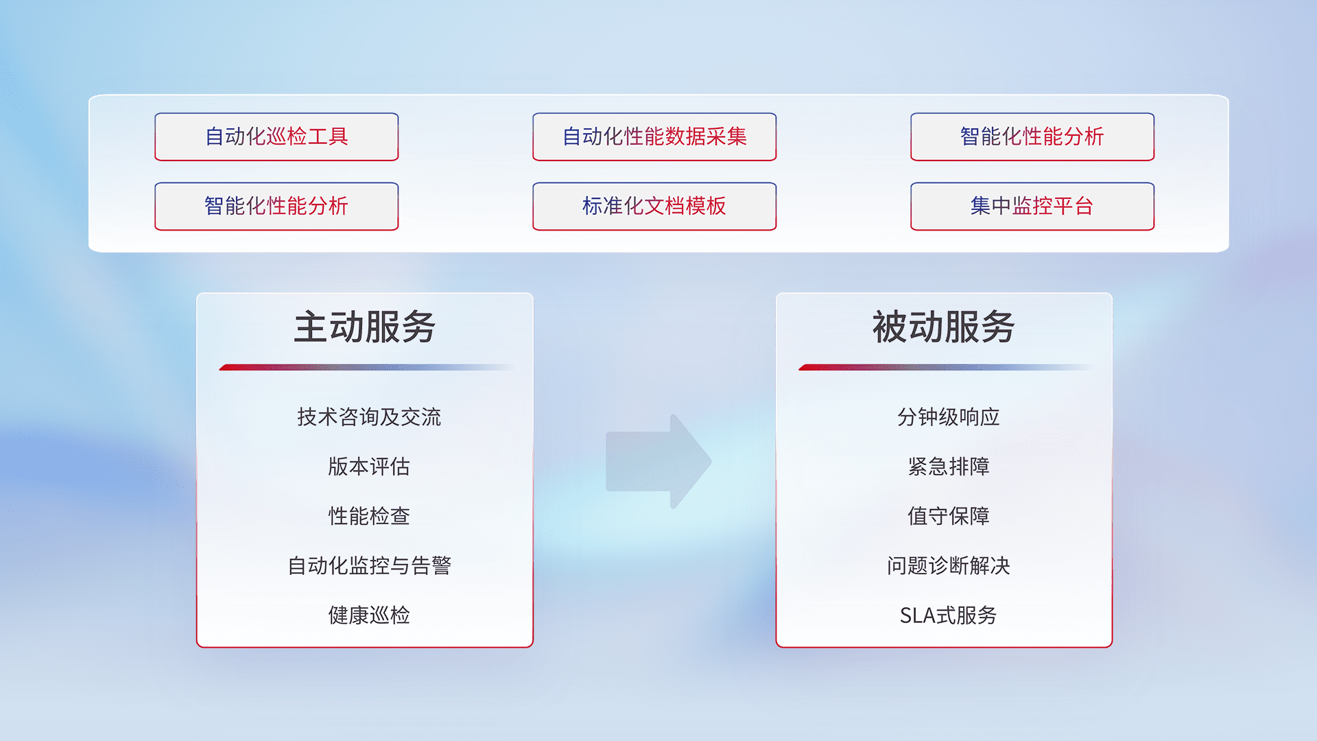 智能化工具和标准化文档,,,,保障服务质量,,提供主动服务(包含技术咨询、、版本评估、、性能检查、、自动化监控与告警、、健康巡检)和被动服务包含(分钟级响应、、紧急排障、、值守保障、、、、问题诊断解决、、、SLA服务)。。