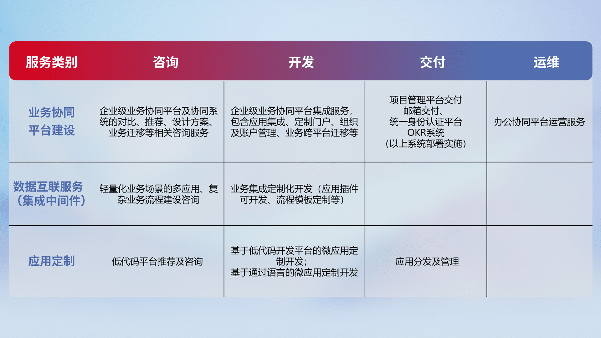 针对钉钉、、企微、、、、IDaas等平台级产品提供产品的规划、、方案、、交付、、、定制化开发等服务,,实现如统一协同办公、、智能客户服务、、、、混合会议管理、、智能数据查询、、等业务场景,,实现数字化转型。。。